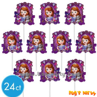 24 piece(s) pick for Sofia The First theme party! these plastic picks are decorated with paper printed Princess Sofia on both sides, 2-sided designs, so awesome! approximately 3 inches tall.