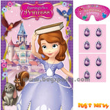 1 set Sofia the First theme party game, it doubled as backdrop decoration, great for photo taking! features 1 poster, 8 stickers and 1 paper blindfold for 2-8 kids! stick poster to wall, it add new dimensions to traditional Pin The Tail on Donkey game. Have kids blindfold, spin them to disorientate the bearing, and whoever put the sticker closest to right spot wins! Poster size 38 x 24 inches.
